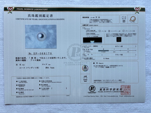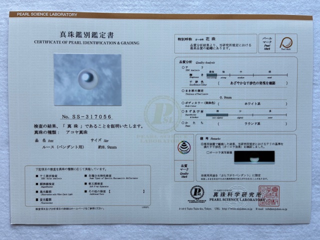 フォームこそ変わっていませんが、鑑定書はちょいちょいアップデートされていますので、今回のものについてちょっと解説しますね。備考欄をご覧ください。使用用途を「ぶら下がりペンダント」に限定と記載されています。また、品名にはルース(ペンダント用)とありますね。つまり、この真珠を使ってブローチやリングに仕立てると、この鑑定書は無効になりますよってことを明文化したわけです。また、ぶら下がりタイプのペンダントに仕立てた場合は、手数料を支払うことで鑑定書の再発行が可能です。再発行すると、左面に掲載された写真がペンダント完成状態のものに差し替えられ、右面備考欄の使用用途を云々の文章が削除されます。そして、ここが注意ポイントですが、鑑定書番号が変わります。以前はできたことですが、現在は鑑定書番号の引き継ぎはできなくなりました。