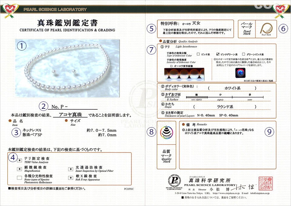 真珠科学研究所発行の真珠鑑別鑑定書にはいくつかのバリエーションがありますが、現在は「オーロラ花珠」は「SSタイプ」、「オーロラ天女」は「SPタイプ」と決められています。