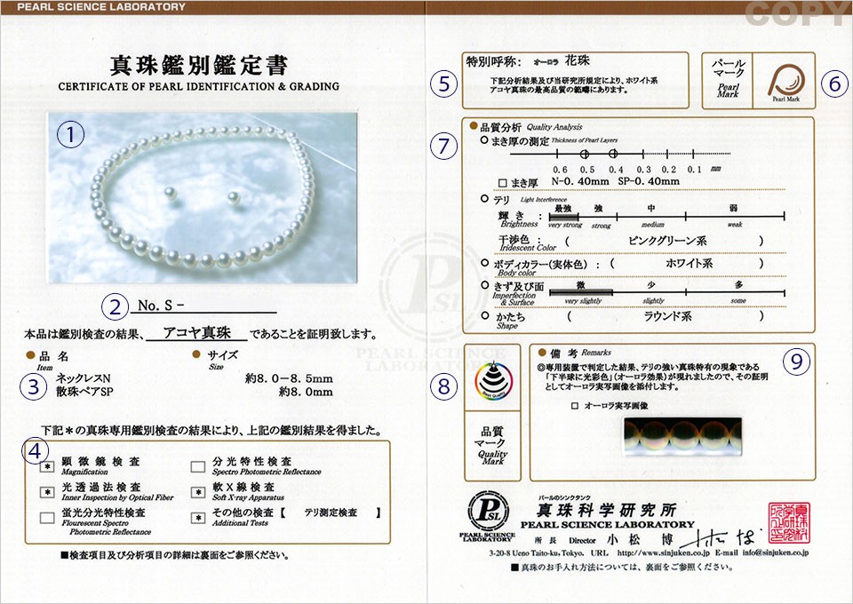 ● SSタイプ鑑定書(オーロラ 花珠、彩凛珠、アコヤクイーン、金色、真多麻)